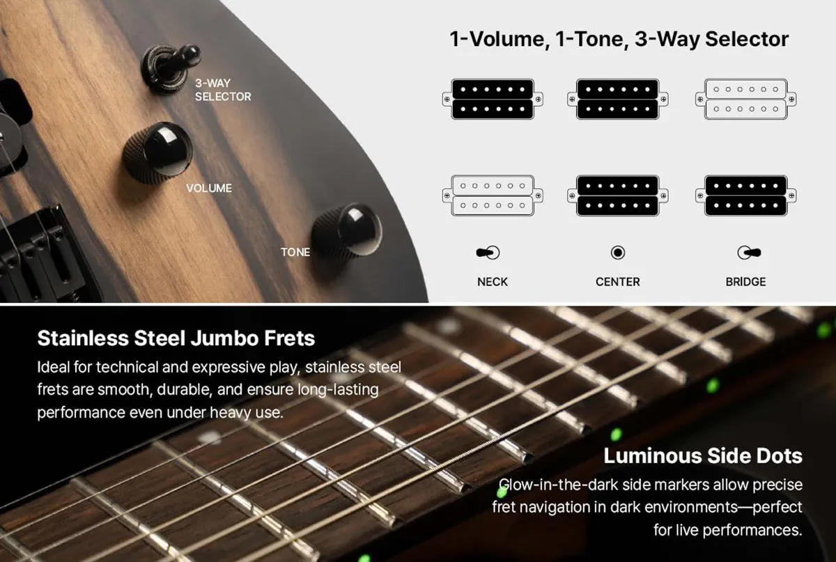 Светящиеся в темноте боковые маркеры обеспечивают точную навигацию по ладам в темных помещениях — идеально для живых выступлений.