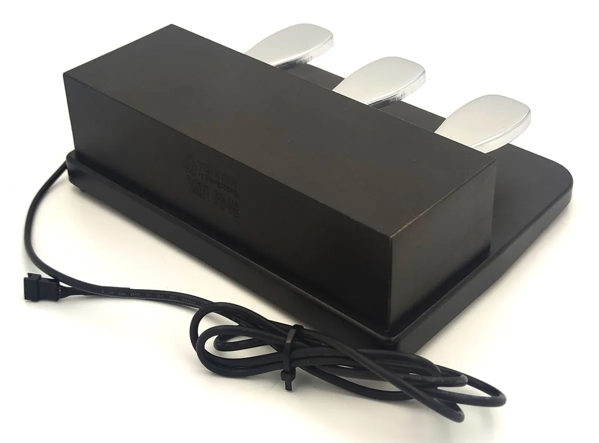 Тройной блок устанавливается непосредственно на пол и предоставляет полный функционал: soft (левая педаль), sostenuto (средняя педаль), sustain (правая педаль).
