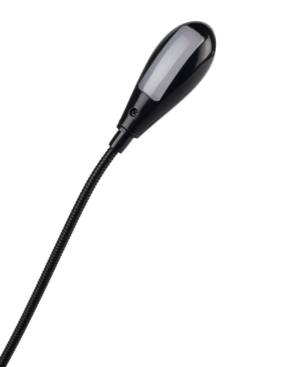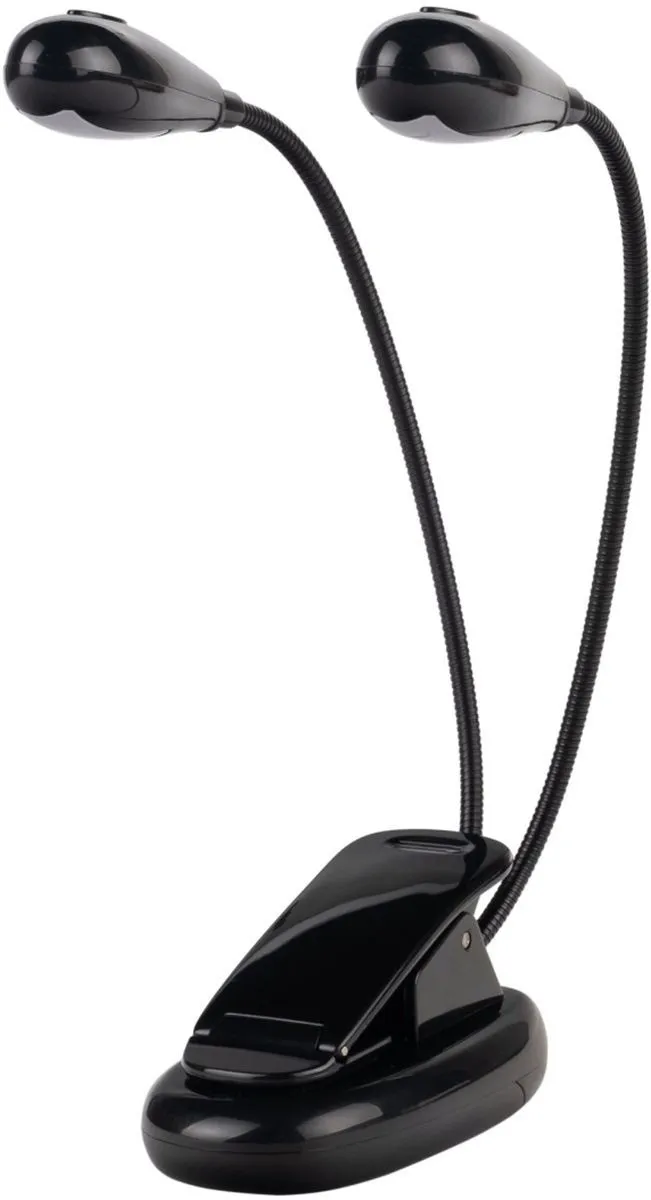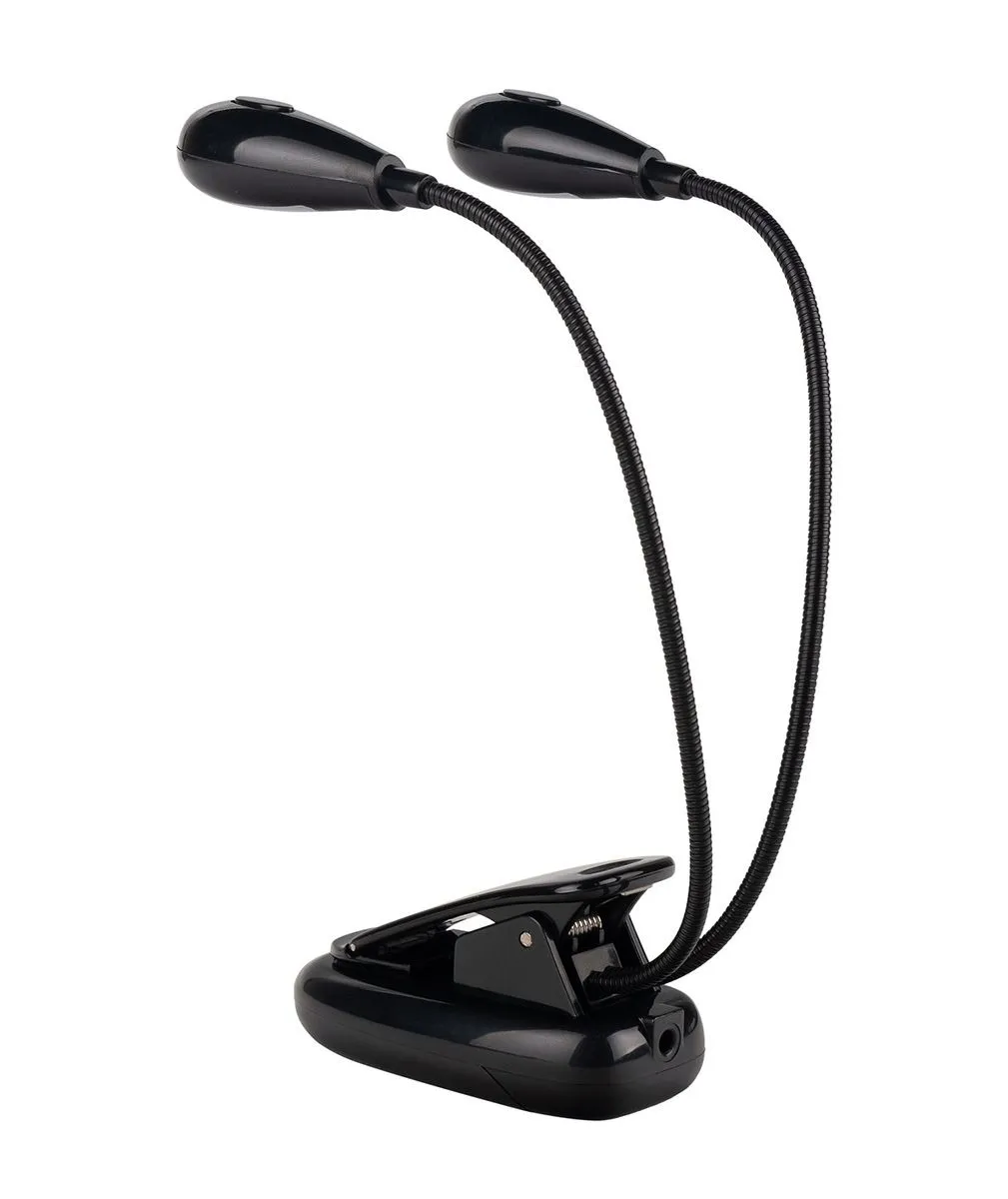 Светильник светодиодный для пюпитра или клавишных. Крепление типа прищепка. Две гибкие ножки, по два светодиода. Цвет: черный. Блок питания USB в комлпекте. Также работает от батарейки ААА